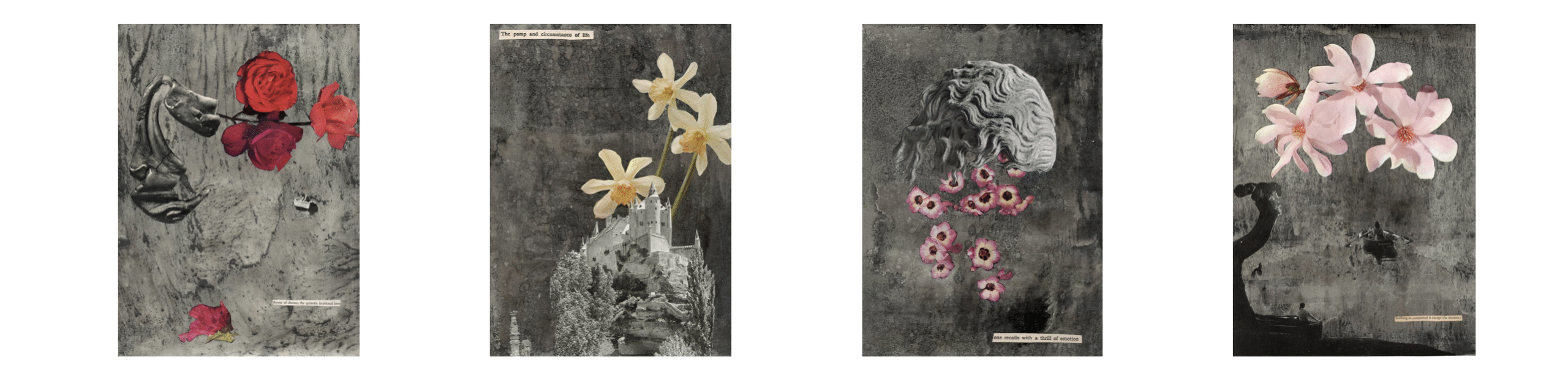 These works are soundings of our times, they plunder sources using the language of collage to produce a